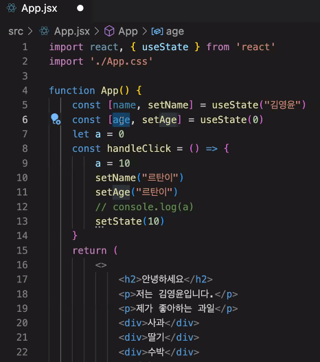 ๋ณ์๋ a = 0์ด๋ฐ์์ผ๋ก ์ ์ธํ๋๋ฐ ๋ฆฌ์กํธ์์๋ setAge(10)์ด๋ฐ์์ผ๋ก ์ฌํ ๋น ์ ์ธํ๋ค๊ณ ์๊ฐํ๋ฉด๋๋ค.