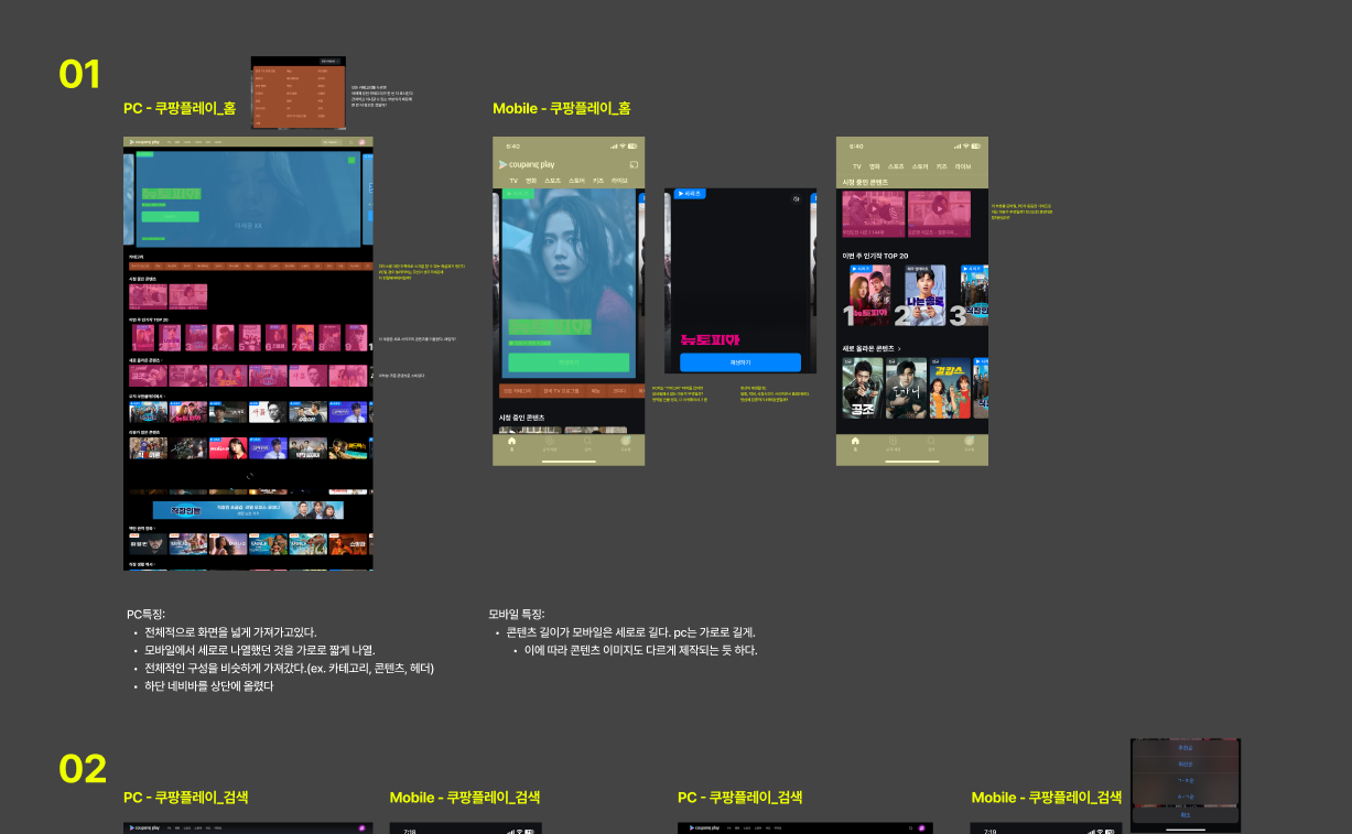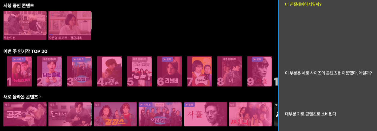 ex. ๋ชจ๋ฐ์ผ: ๊ฐ๋กํญ ์ข๊ณ , ํฐ์น์์ญ, ๋ฆฌ์คํธ๋ฅผ ์บ๋ฌ์ ๋ก ํํ.pc: ๊ฐ๋กํญ์ด ๋๋ค, ์บ๋ฌ์ ์ด ์๋ ๋๋ณด๊ธฐ ๋ฒํผ ์ด์ฉํ๋ค๋์ง ์บ๋ฌ์ ํํํ ์๋์๊ธดํจ.