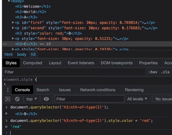 document.querySelector('h3:nth-of-type(2)').style.color = 'red';