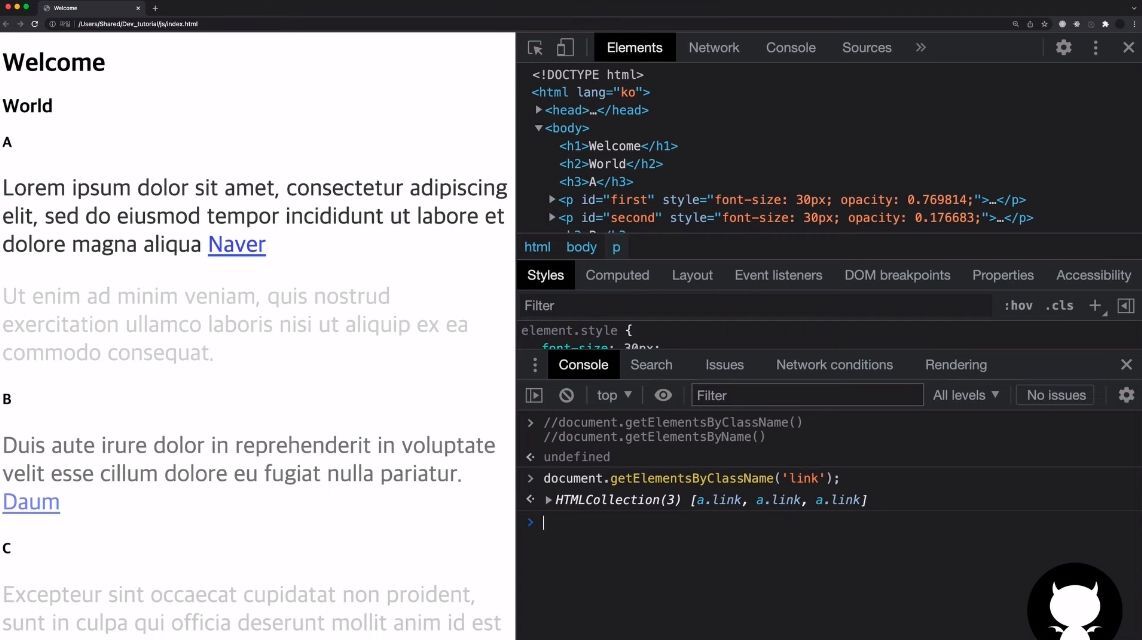 -getElements๋ฅผ ์ด์ฉํ๋ฉด ClassName์ด๋ ByName์ผ๋ก node์ ์ ๊ทผํ ์ ์๋ค.