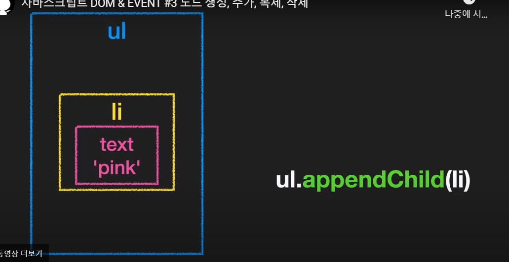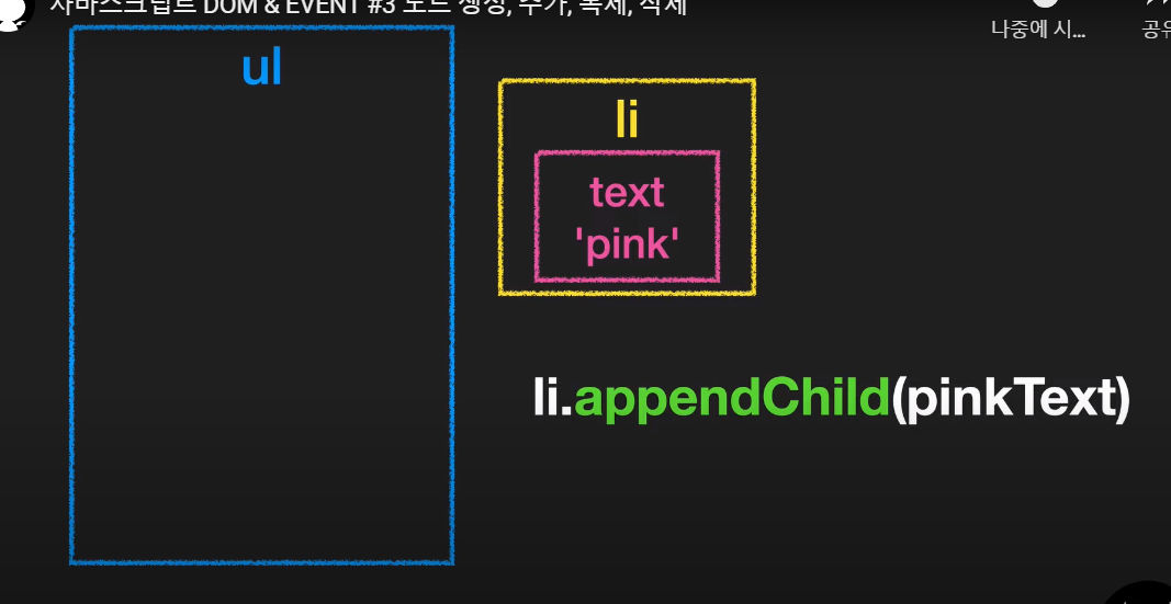 ๊ทธ๋ค์ li์ appendChild(pinkText)์ด์ฉํด์ ๋ฐฉ๊ธ ๋ง๋ text node๋ฅผ ๋ฃ์ด์ค๋ค.