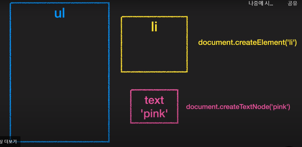 - document.createTextNode('pink')๋ ๋ง๋ค์ด์ค๋ค.