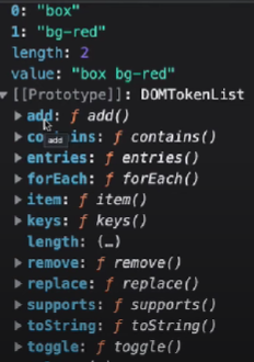 box.classList.replace('bg-red', 'bg-blue'); 해석: bg-red를 bg-blue로 바꾼다. |