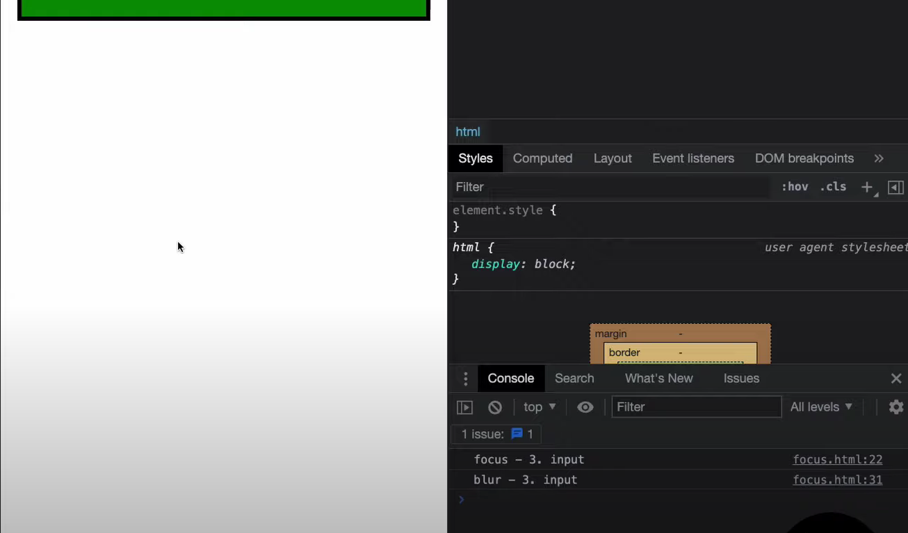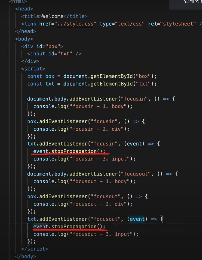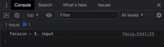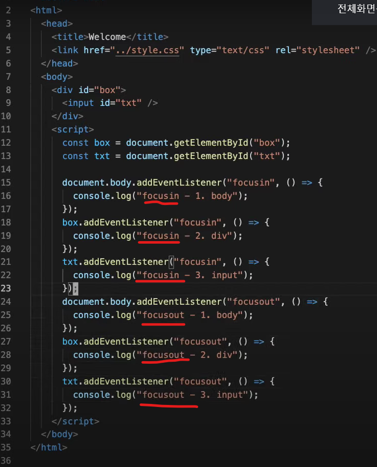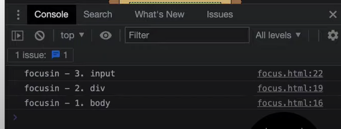 - focusin์ ํ์ง๋ง ์ด๋ฒคํธ๋ฒ๋ธ๋ง์ด ๋ฐ์๋์ง ์์๋ค. focusout ๋ ๋ง์ฐฌ๊ฐ์ง(์ด๊ฑด ์๋ตํ๊ฒ ๋ค)