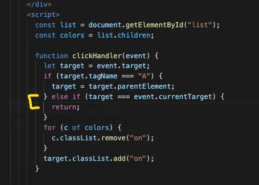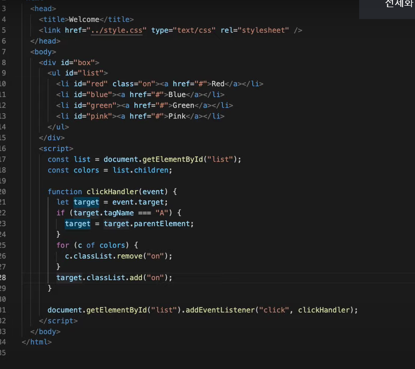 - clickHandler๋ผ๋ ํจ์๊ฐ ์๊ณ ๊ทธ ์์ ๋ชจ๋ <li>์ "on"class๋ฅผ ์ ๊ฑฐํ๊ณ ํด๋ฆญ๋ <li>์ "on"class๋ฅผ ์ถ๊ฐํด์ฃผ๊ณ ์๋ค.