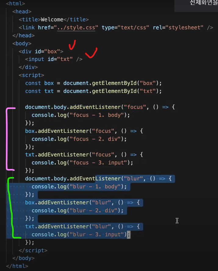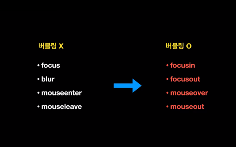 - ๋๋ถ๋ถ์ ์ด๋ฒคํธ๋ ๋ฒ๋ธ๋ง์ผ๋ก ์ ํ๋์ง๋ง ์ผ๋ถ๋ ๊ทธ๋ ์ง ์๋ค. ์ฌ๊ธฐ์ ์ผ๋ถ๋ focus์ blur๋ฅผ ์์๋ก ๋ค ์ ์๋ค. ๋ฐ๋ผ์ ์๋์ ๊ฐ์ด ๋ฐ๊ฟ์ผํ๋ค.