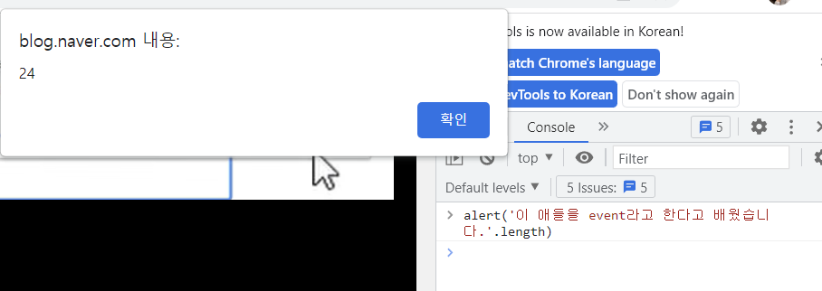 ๊ทธ๋ฆฌ๊ณ ๋ค์ ๋งจ ์ฒ์๊บผ๋ฅผ alert๋ก ๊ฐ์ธ๊ณ ์ํฐ ๋๋ฅด๋ฉด 24๋ผ๋ ๊ฒฝ๊ณ ์ฐฝ์ด ๋ฌ๋ค. (=์ด 24๊ฐ์ ๋ฌธ์๊ฐ ์๋ค)