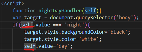 2. ํจ์ nightDayHandler๊ฐ ์คํ๋ ๋ ()๋ก ๋ค์ด์ค๋ ๋งค๊ฐ๋ณ์ 'self'๋ ์ด๋ฆ์ ๋งค๊ฐ๋ณ์๋ฅผ ๋ฃ์ด์ค๋ค.