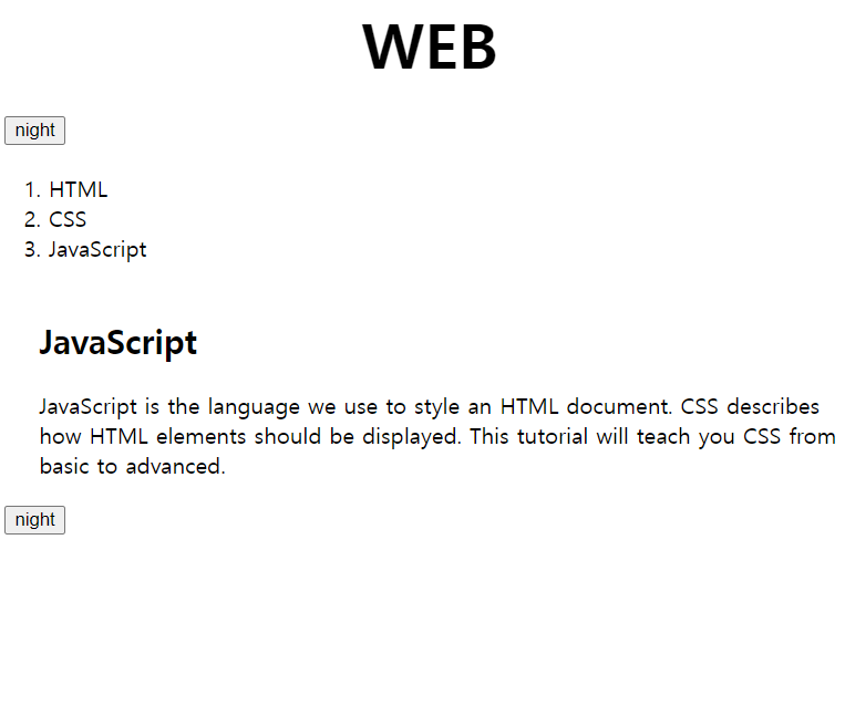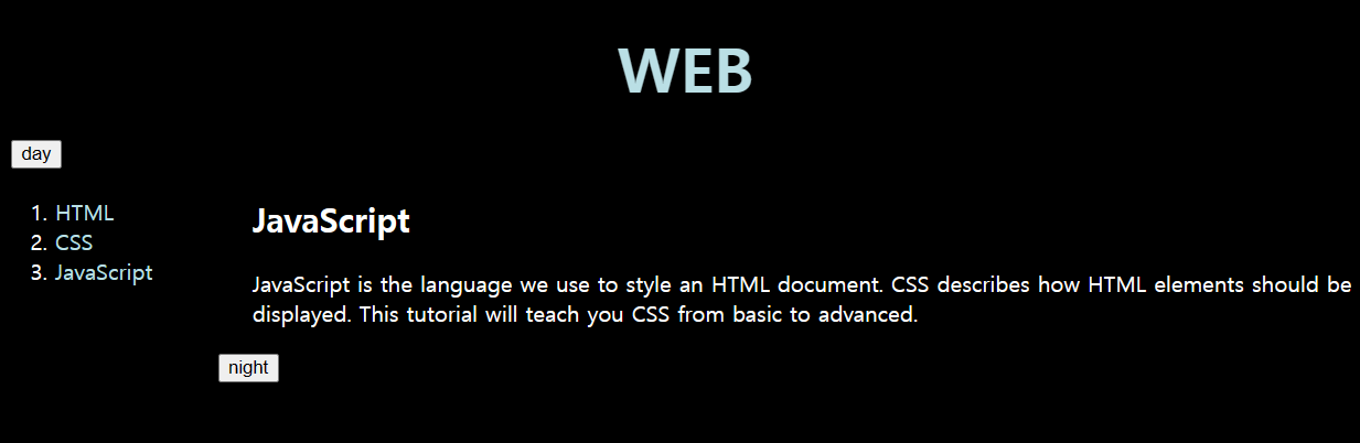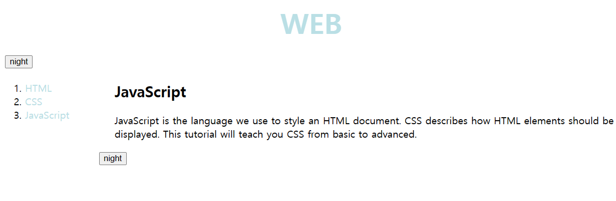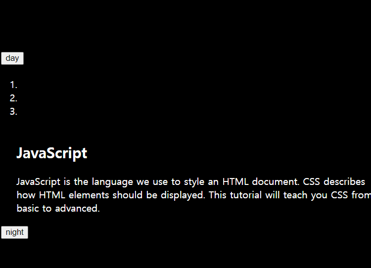 ์ ์๋ฐ์คํฌ๋ฆฝํธ ๊ฐ์ผ๋ก ์ธํด night ๋๋ฅด๋ฉด ๋ฐฐ๊ฒฝ ๊ฒ์ ์ ๋ฐ๋๊ณ ๋ฐ๋๋ก day๋๋ฅด๋ฉด ํฐ์์ผ๋ก ๋ฐ๋๋ค.