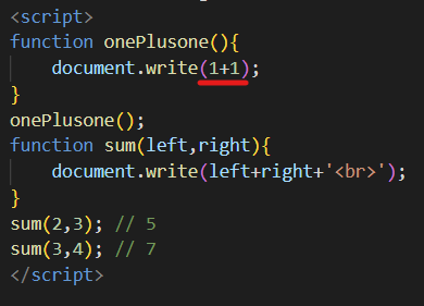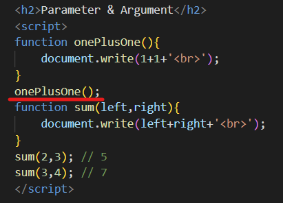 โ 3. ์๋ณด๊ณ ๋ค์ ๋ณต์ตํ์ ๋ ์ ๋ถ๋ถ์ด ์ ๋ค์ด๊ฐ๋๊ฑด์ง ์ดํด๊ฐ ์๊ฐ์. ๋ค์ ๊ฐ์๋ฅผ ๋ณด๊ณ ๋ต์ ์ป์. ![]() onePlusOne(); ์ด ์๋ ํจ์๋ฅผ ํธ์ถํ๊ฒ. ์ฆ, ๋นจ๊ฐ ์ค์ด ์ณ์๋ ์๋ฆฌ์ document.write(1=1='<br>') ์ด๋ผ๋ ์ฝ๋๊ฐ ์๋ค๊ณ ์๊ฐํ๋ฉด๋๋ค. |