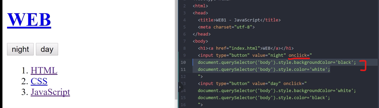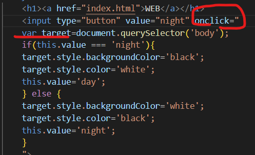 - onclick์ ์์ฑ๊ฐ์ ๋ฐ๋์ JS์ด์ด์ผํจ.