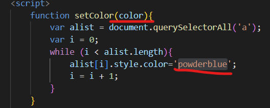'powderblue'๋ฅผ 'color'๋ก ๋ฐ๊พธ๋ฉด, ๋งค๊ฐ๋ณ์๋ก ์ธํด์ ์ ๊ธฐ ์๋ ๊ฐ์ด ๋ฐ๋๊ฒ๋๋ค.
