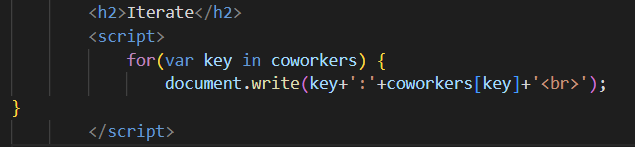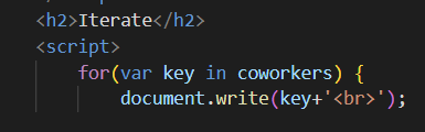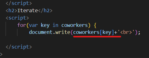 | document.write( key + ' : ' + coworkers[key] +'<br>'); |