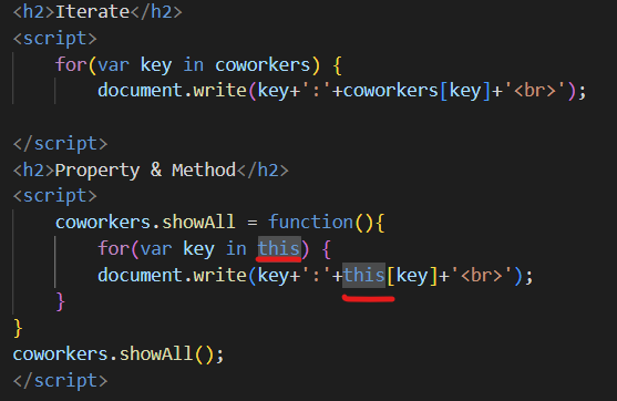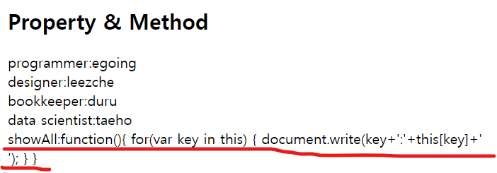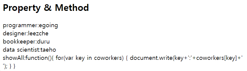๊ฐ์ฒด์ ์์๋ ํจ์(๋ฉ์๋)๋ฅผ ๋ง๋ค ์ ์๋ค. ===> coworkers.showAll();