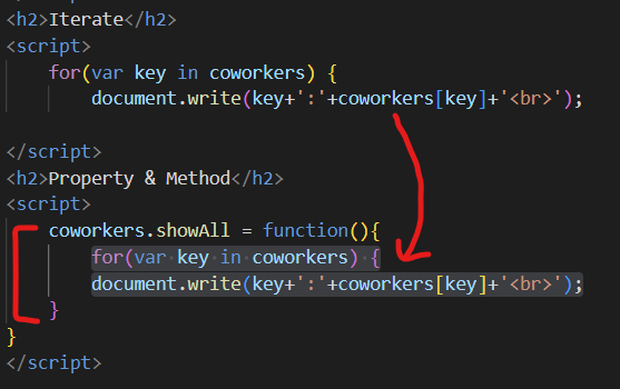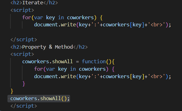 ๊ฐ์ฒด(coworks)์ ์์๋ ๋ณ์(showAll)์ ๊ฐ์ผ๋ก ํจ์( function(){} )๋ฅผ ์ง์ ํ ์ ์๊ณ