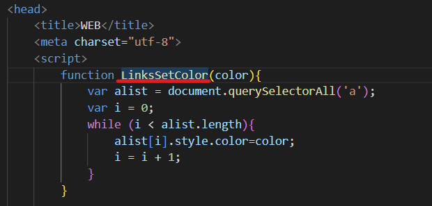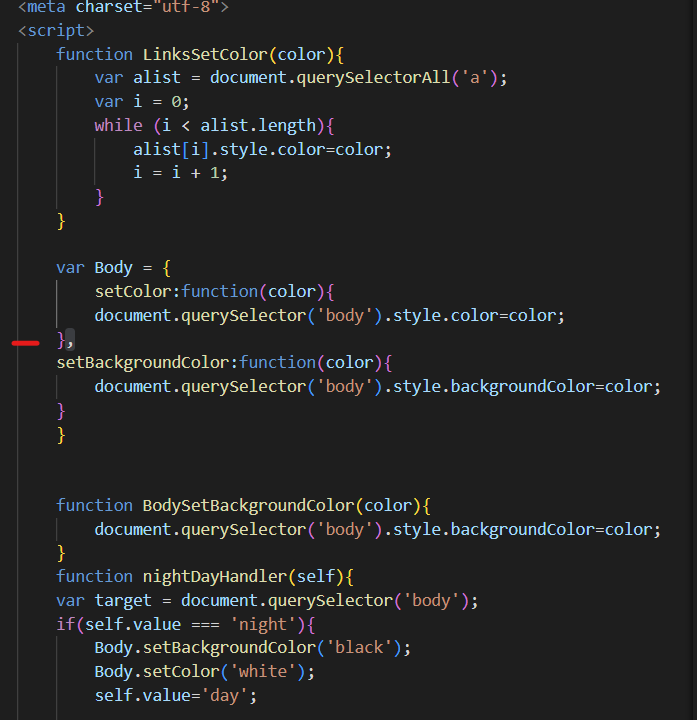| var links = { setColor:function(color){ var alist = document.querySelectorAll('a'); var i = 0; while (i < alist.length){ alist[i].style.color=color; i = i + 1; } } } |