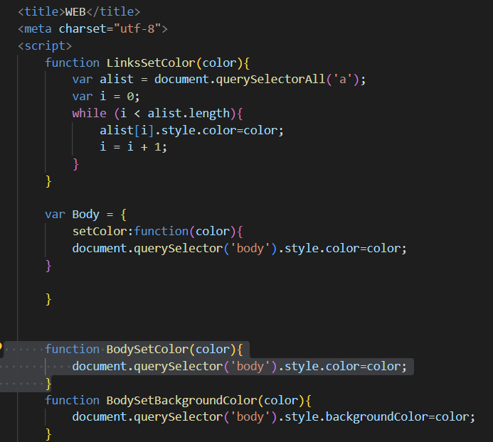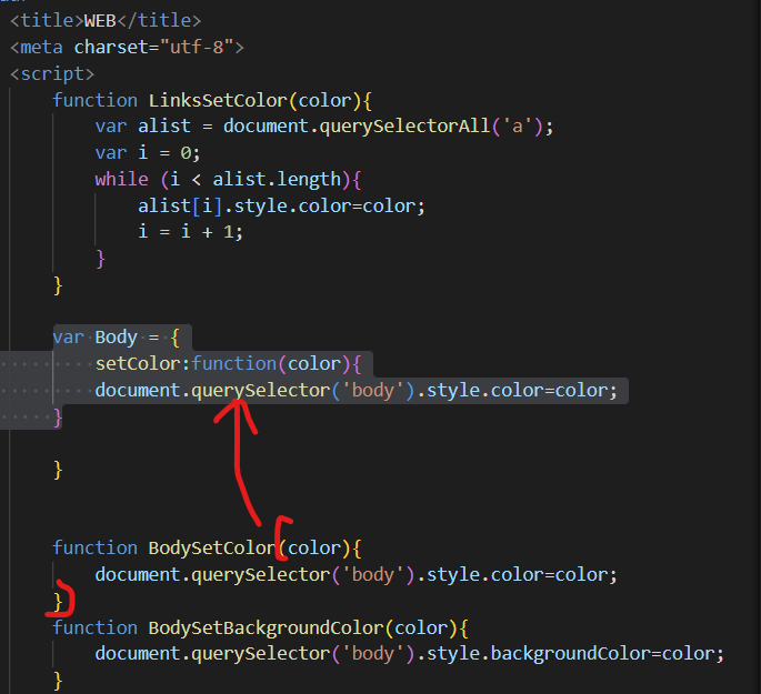 | var Body = { setColor:function(color){ document.querySelector('body').style.color=color; } |