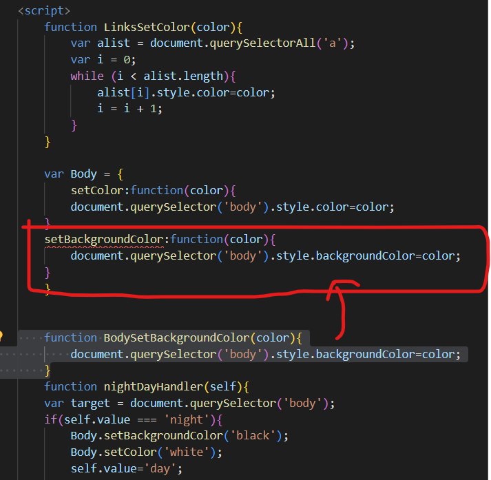 | var Body = { setColor:function(color){ document.querySelector('body').style.color=color; } |