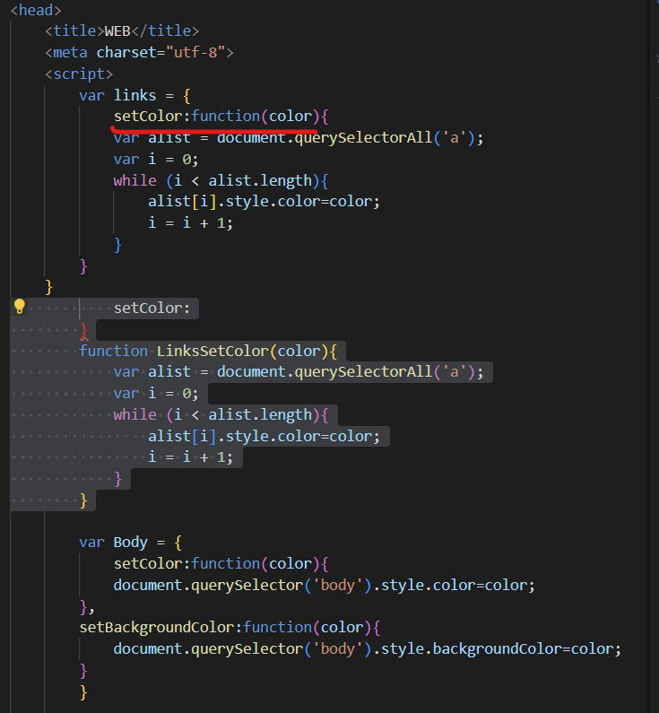 | var links = { setColor:function(color){ var alist = document.querySelectorAll('a'); var i = 0; while (i < alist.length){ alist[i].style.color=color; i = i + 1; } } } |